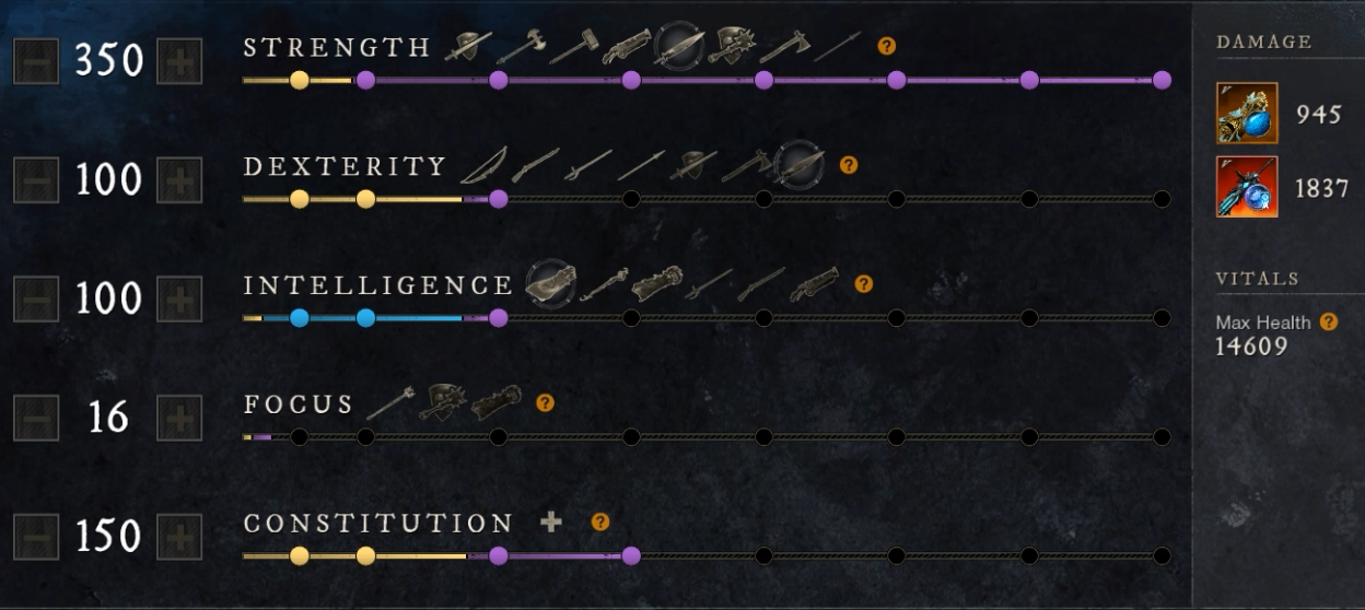 Ideally this build would be 350 STR, 200 DEX and 150 CON. I only have 100 INT because of some gear limitations! You can always take some points out of DEX if you want to run more CON as well.