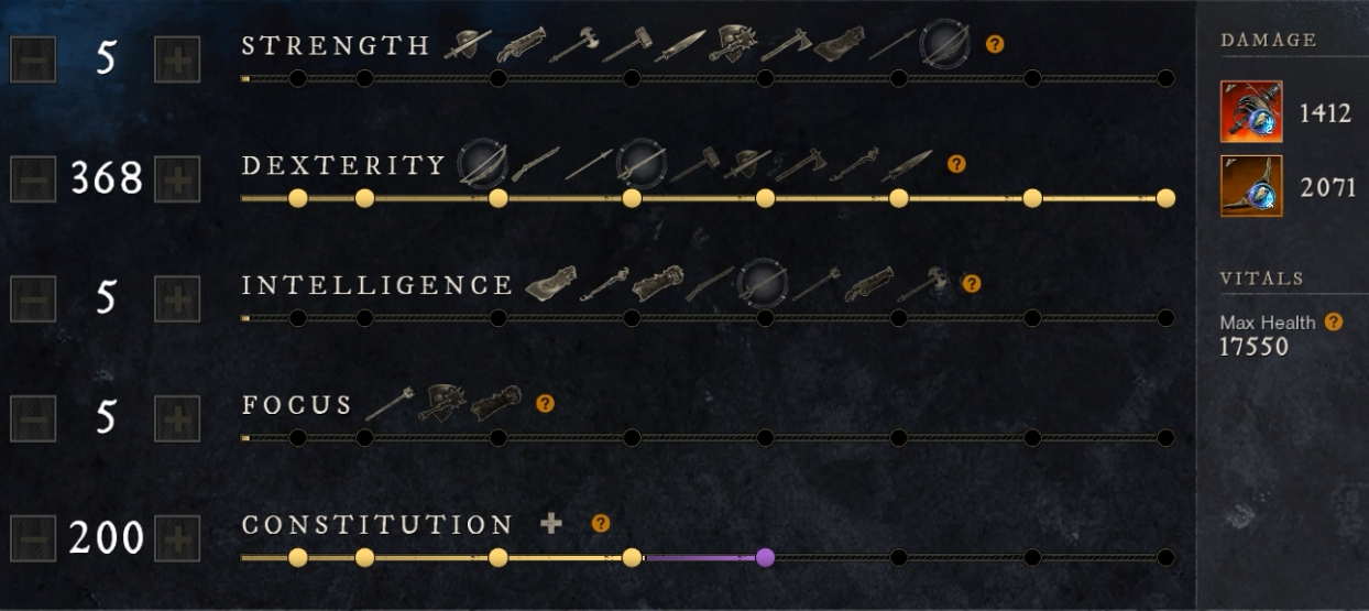 This builds attributes are nice and simple! Feel free to put more or less into CON depending on preference.