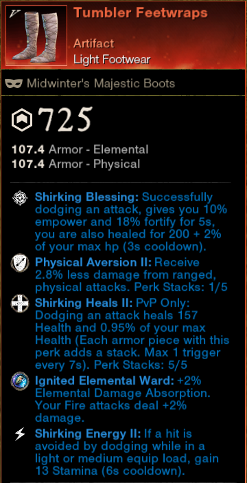 The Tumbler Feetwraps are huge for this build. They give us empower and fortify while healing, but the shirking energy perk they have STACKS with the ones on our legs. This is huge for stamina sustain!