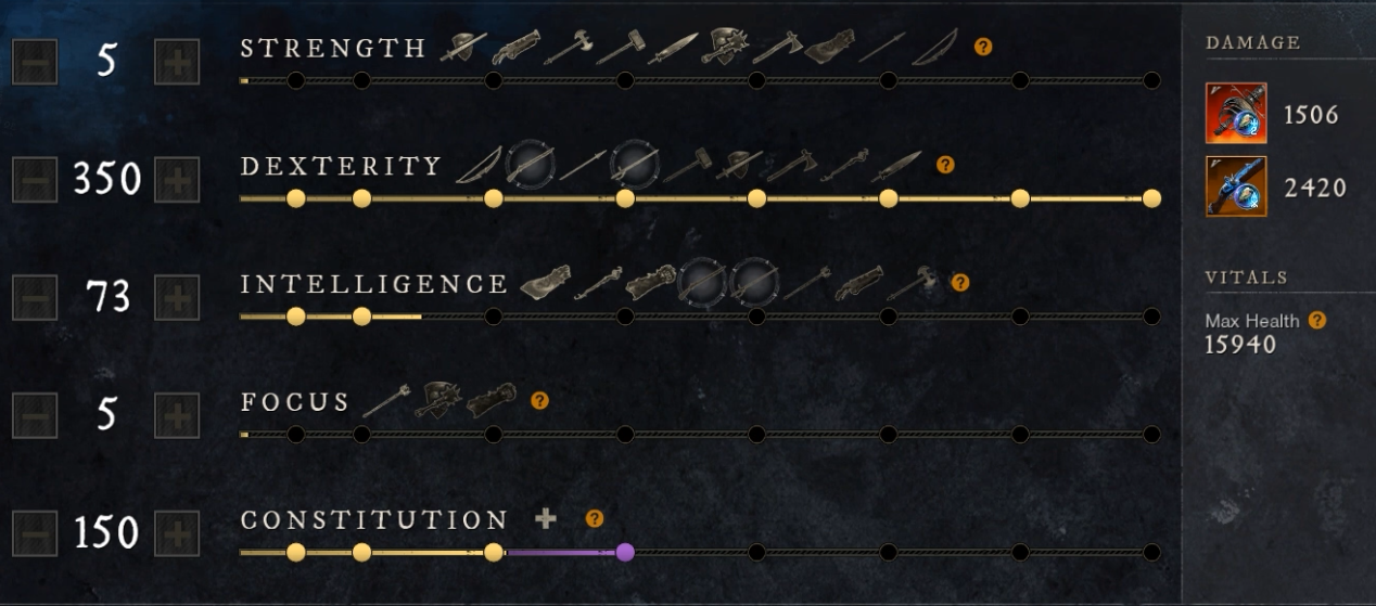 Since the 100 and 150 INT jump points get nerfed I have gone for a full thrust damage spec this patch. You can always run more or less con depending on your preference!