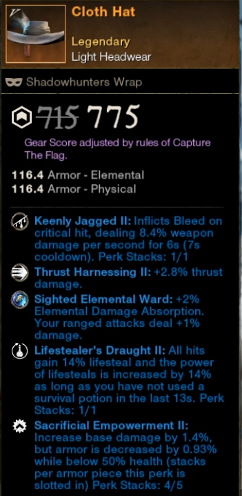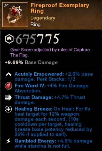 The goal with my gear was to focus on 3 main perks: Shirking Heals, Thrust Harnessing and Sacrificial Empowerment. These are the most important perks for this builds damage and defense!