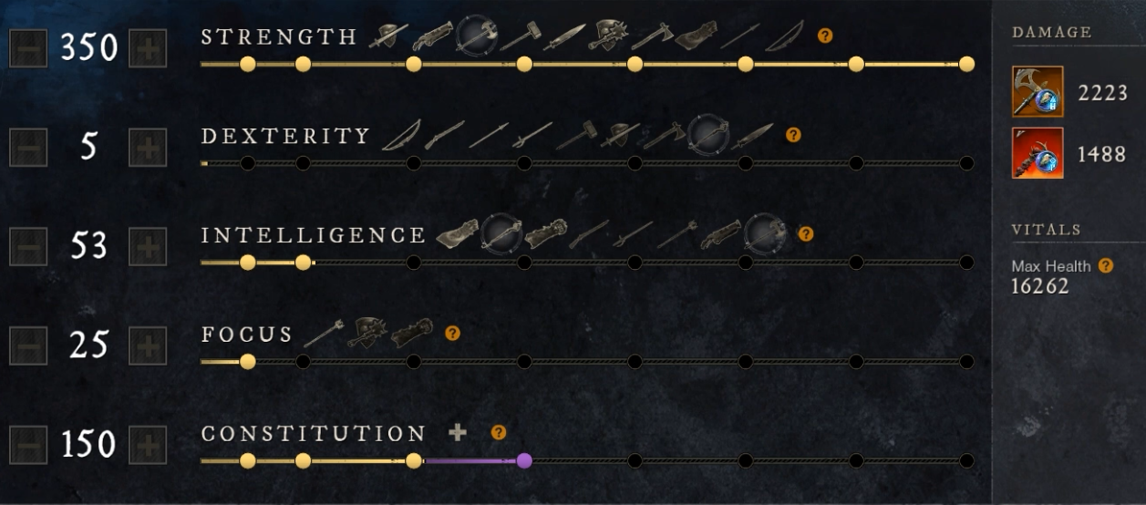 This is primarily a STR build but I highly recommend at least 50 INT for that inferno damage! You can always take some points out of STR and put them into CON if you want to be more durable.