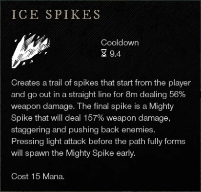 Ice Spike is a fantastic offensive skill that can deal quite a bit of damage if all the hits connect. The stagger from this skill also makes it a great defensive utility that can interrupt or stop opponents from charging at you. This skill also has a very short cooldown, but can be a difficult skill to learn to time properly!