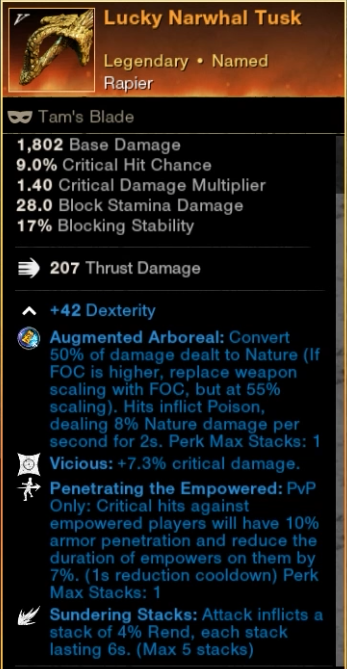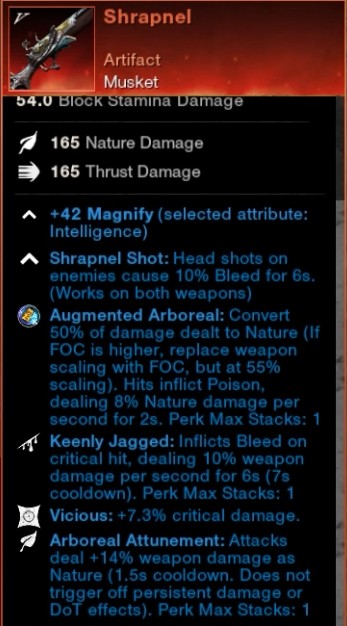 Now, ideally for musket damage you would run a 725 musket with the same perks as my Shrapnel, but have finisher on your back bar. This however comes at the cost of your rapier now doing much less damage since Finisher has pretty bad actual damage perks for a grace tree rapier setup. If you’re like me and DON’T have a good 725 musket, then Shrapnel is actually a pretty good (and easy to get) choice damage wise while also allowing you to run a very damage focused rapier like my Narwhal Tusk. The perks for my weapon setup are perfect here too!